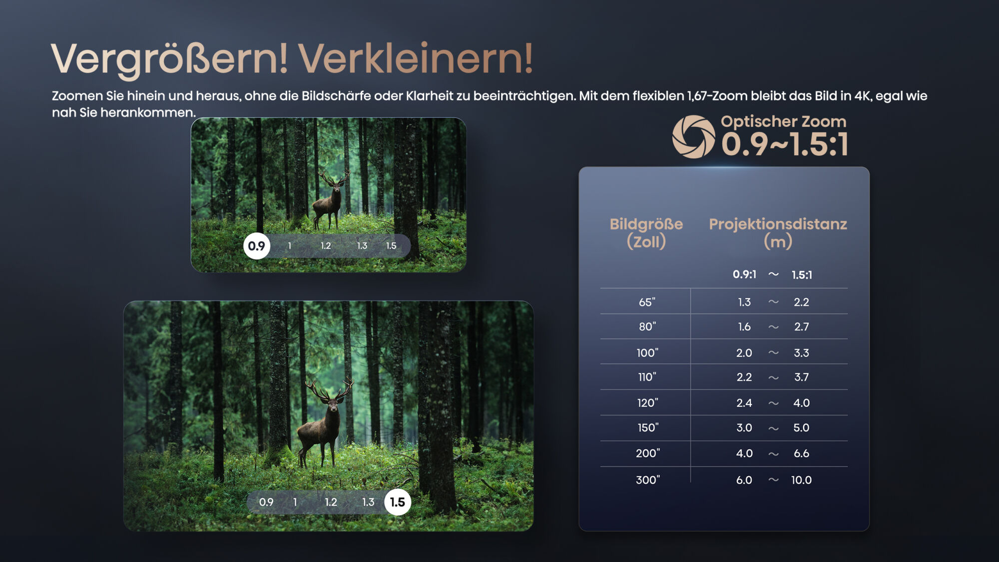 Projektionsverhältnis | 0,9-1,5 | 0,9-1,5 | 1,2 | 1,2 | C2 Ultra und C2 Pro unterstützen optischen Zoom |