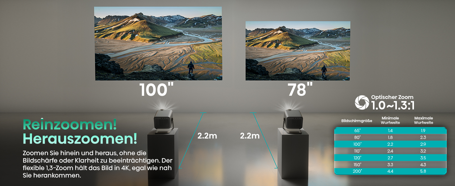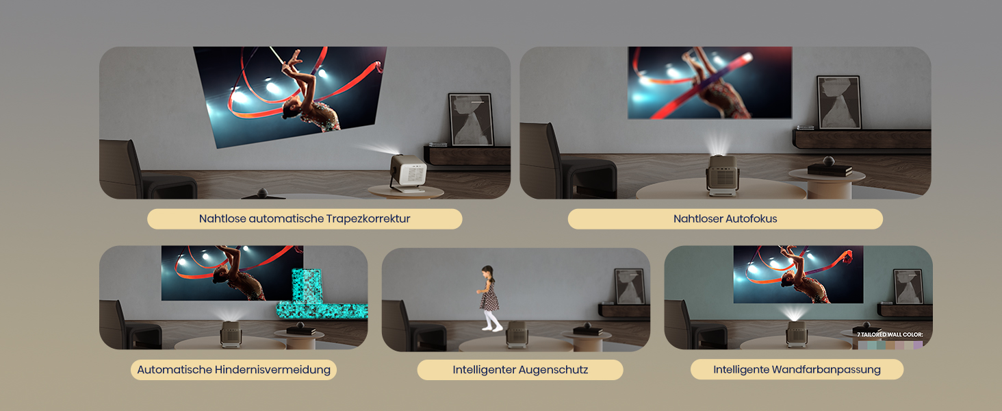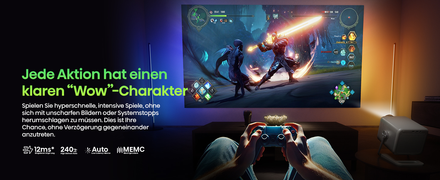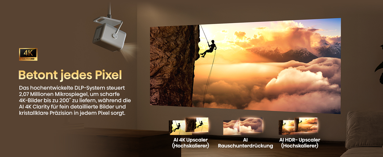 Dank der 4K-Shifting-Technologie werden Inhalte in hoher Auflösung projiziert, während KI-basierte Bildoptimierung und MEMC-Zwischenbildberechnung für eine flüssige, detailreiche Darstellung sorgen – ideal für Filme, Serien und Gaming.