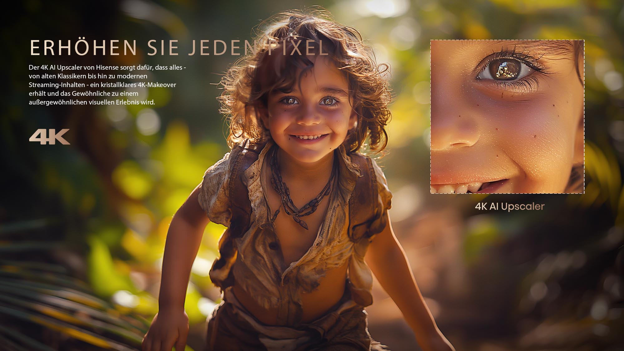 Der 4K AI Upscaler des Hisense PX3-Pro sorgt für eine optimierte Bildqualität, indem er Inhalte mit niedrigerer Auflösung auf nahezu 4K-Ultra-HD-Niveau hochskaliert. Diese Technologie nutzt künstliche Intelligenz (AI) und maschinelles Lernen, um Bilddetails zu rekonstruieren und die Schärfe sowie Klarheit von nicht-nativen 4K-Inhalten zu verbessern.