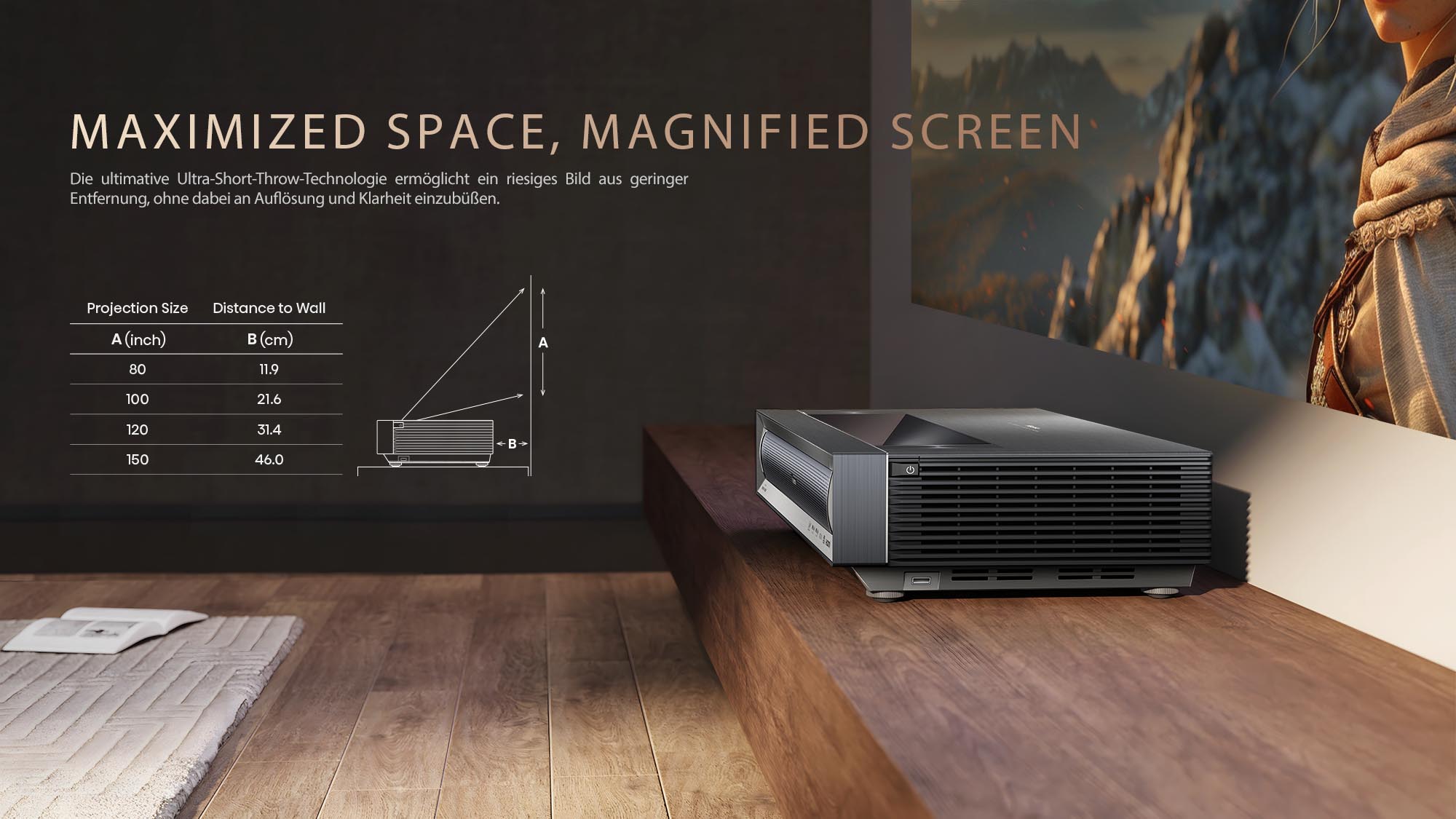 Helligkeit von 3000 ANSI Lumen: Die Laser-Einheit sorgt für eine hohe Lichtleistung, wodurch auch größere Bilddiagonalen von bis zu 150 Zoll in gut abgedunkelten Räumen optimal dargestellt werden können.