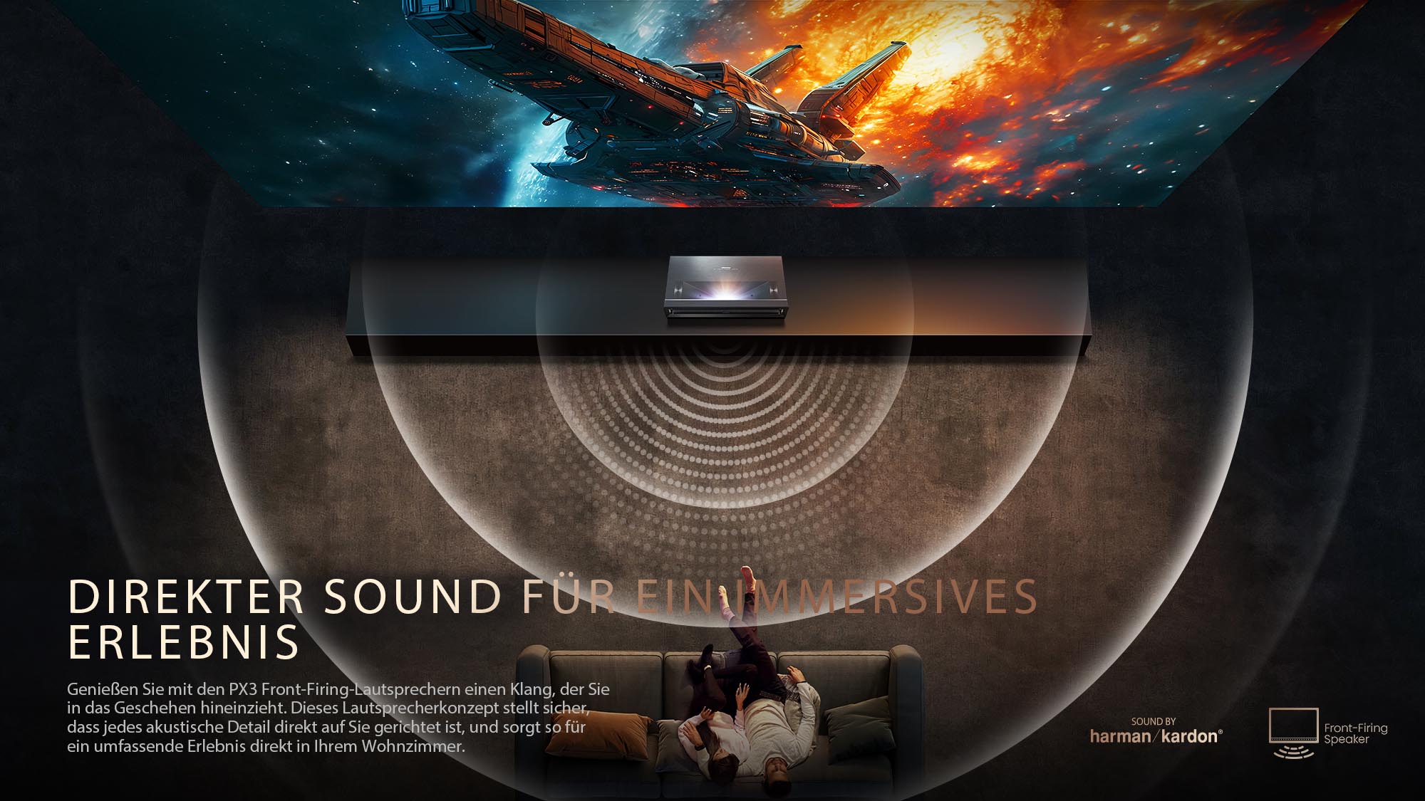 Das Harman Kardon Soundsystem sorgt für ein immersives Klangerlebnis, das perfekt zum visuellen Genuss passt. Das VIDAA U9 Smart TV-System bietet einfachen Zugriff auf beliebte Streaming-Dienste wie Netflix, Disney+ und Apple TV. Dank AirPlay 2 und Apple Home-Integration lässt sich der PX3-PRO nahtlos in Ihr Apple-Ökosystem einbinden und bietet eine benutzerfreundliche, vernetzte Bedienung.