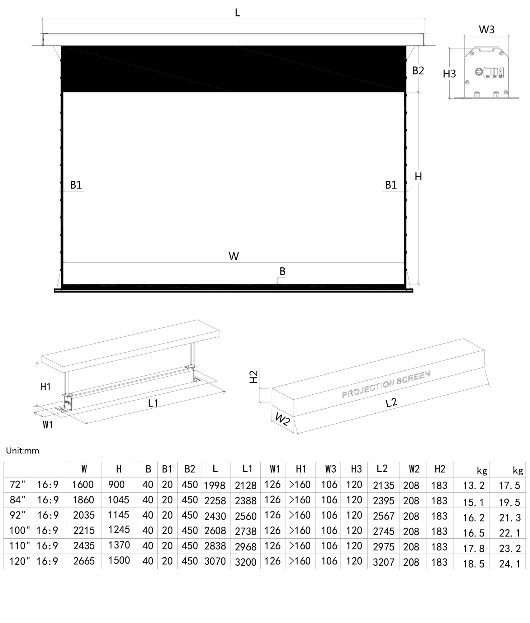 Ausführung | 159 x 89 cm (72"), 185 x 104 cm (84"), 203 x 114 cm (92"), 222 x 125 cm (100"), 244 x 137 cm (110"), 266 x 149 cm (120") |