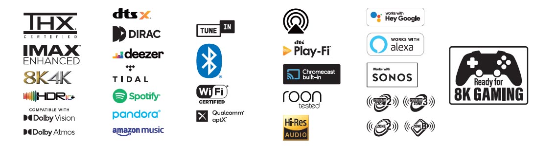 Theaterreferenz Dolby Atmos® oder DTS: X®-Sound über bis zu 7.2.4-Kanäle ergänzt 8K HDR-Video-Passthrough. Schließen Sie 5.2.4-Kanal-Lautsprecher und Zone-2-Lautsprecher an und schalten Sie zwischen 5.2.4-Kanal- und 5.2.2-Kanal- + Zone-2-Wiedergabe um. Nutzen Sie 5-GHz/2.4-GHz-Wi-Fi® und Ihre Stimme, um Musik im ganzen Haus zu steuern.
