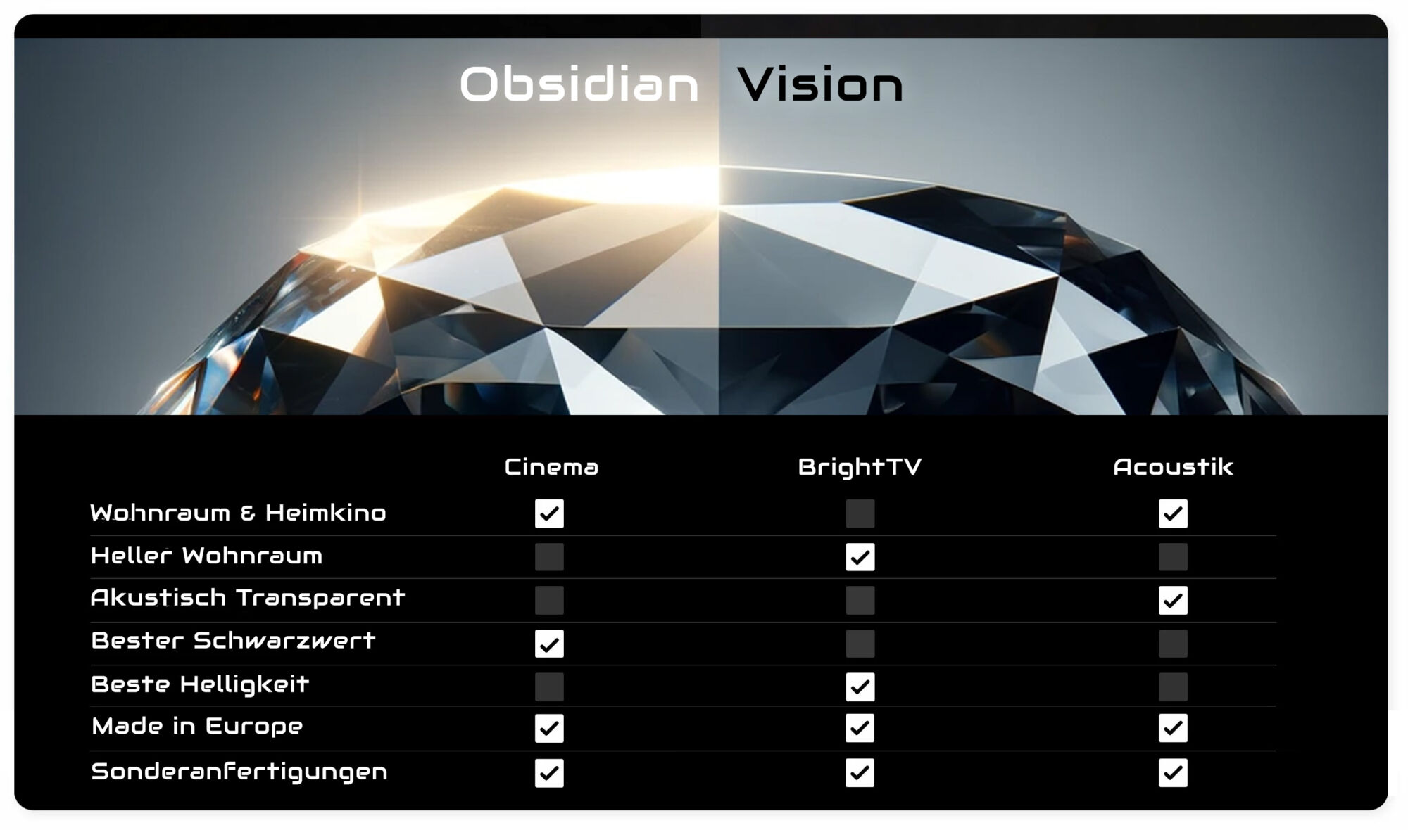 Die Obsidian Vision Cinema Serie zeichnet sich durch eine außergewöhnliche Kombination aus verbesserter Kontrastleistung, optimierten Schwarzwerten und herausragender Qualität aus. Diese Leinwand ist ideal für Film- und Serienliebhaber, die insbesondere abends in ihrem Wohnzimmer oder einem dedizierten Heimkino die bestmögliche Bildqualität mit exzellenten Kontrasten und Tiefenschärfe genießen möchten. Diese Leinwand zeichnet sich durch eine Vielzahl von Highlights aus, die sowohl das außergewöhnliche Kontrasttuch als auch die technischen Merkmale betreffen, welche sie zu einer der besten auf dem Markt machen.