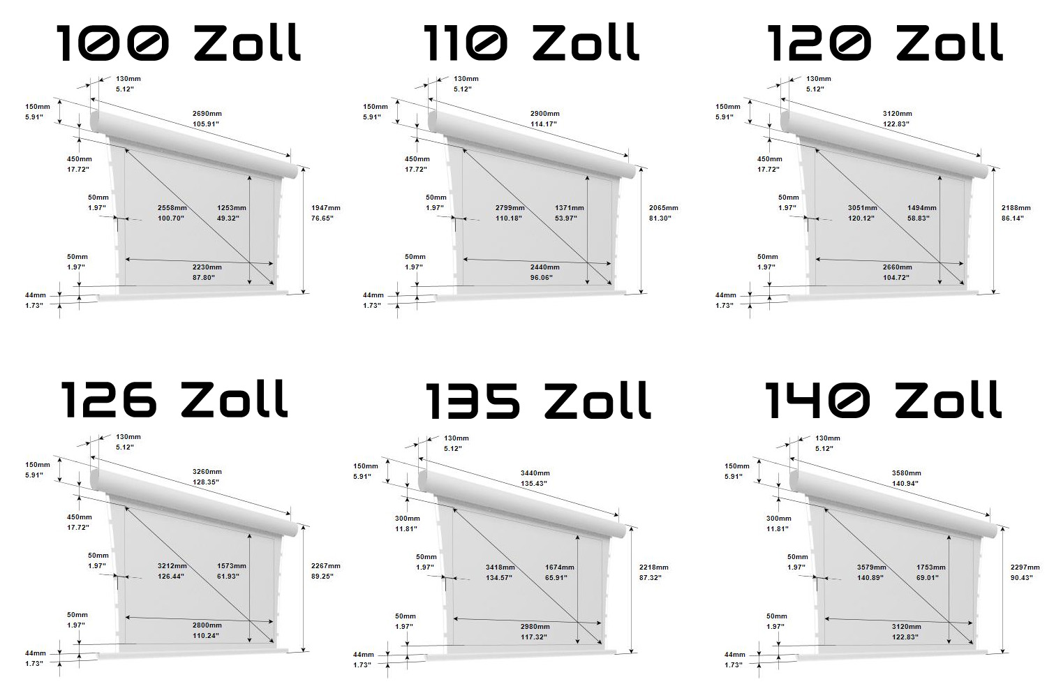 Diagonale ~ | 90 Zoll, 100 Zoll, 110 Zoll, 120 Zoll, 126 Zoll, 135 Zoll, 150 Zoll |