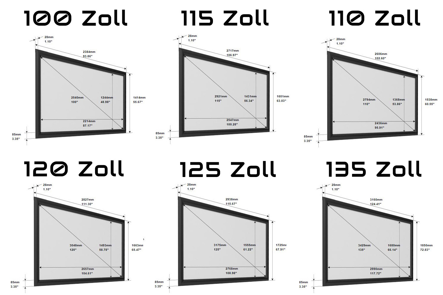 Bildgröße | 203 x 114 cm (92") – 16:9, 221 x 124 cm (100") – 16:9, 244 x 136 cm (110") – 16:9, 254 x 143 cm (115") – 16:9, 266 x 149 cm (120") – 16:9, 276 x 155 cm (125") – 16:9, 287 x 161 cm (130") – 16:9, 299 x 168 cm (135") – 16:9 |
