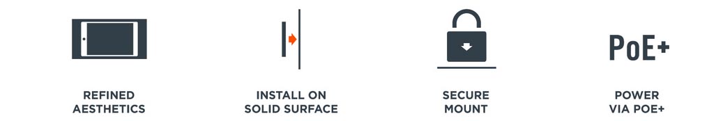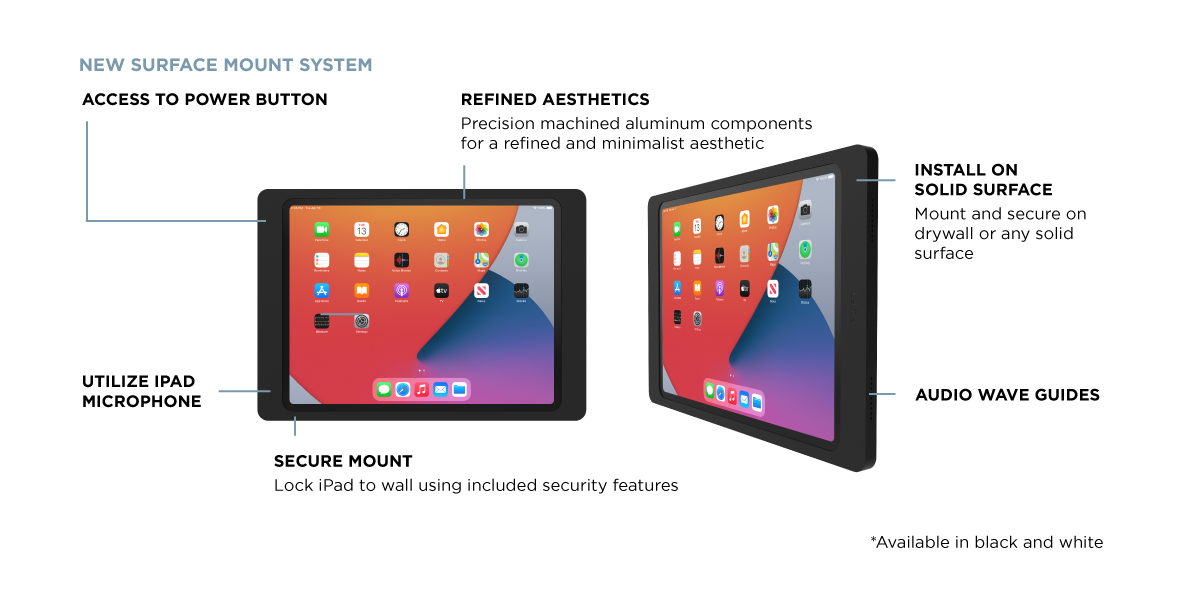 Mit der Oberflächenhalterung wird das iPad an einer Wand oder einer festen Oberfläche befestigt, wobei der Zugriff auf die Einschalttaste, die Mikrofone und die Lautsprecher des iPad vollständig erhalten bleibt. Durch die Verwendung des mitgelieferten IPORT PoE+ Adapters oder PoE-Splitters mit einem Standard Cat5-Kabel kann das Surface Mount bis zu 300 Fuß von einer Stromquelle entfernt betrieben werden. Surface Mount ist in schwarzer und weißer Ausführung erhältlich und ist die beste iPad-Wandhalterung, um das iPad auf jeder Oberfläche zu installieren und gleichzeitig sicherzustellen, dass es sich in Ihren Raum einfügt.