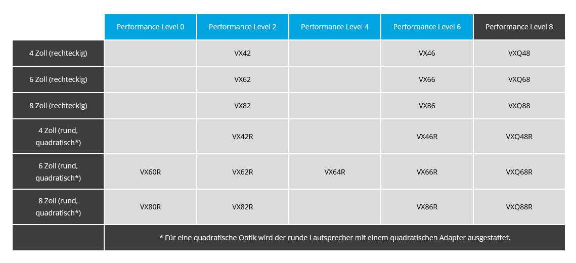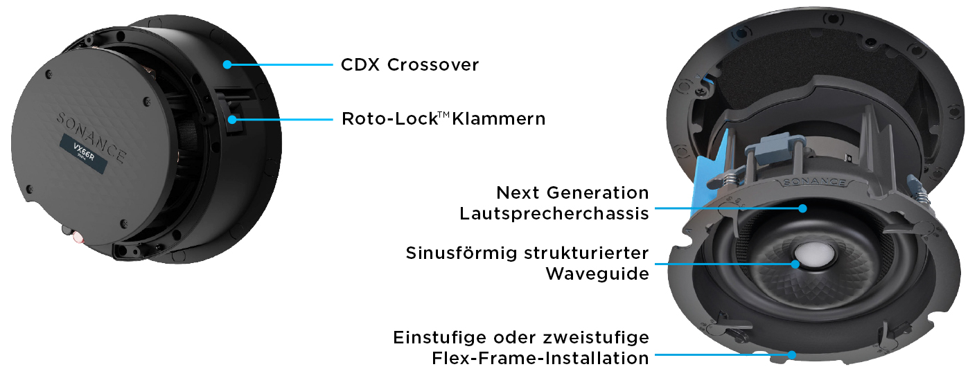Die Einbaulautsprecher der Visual Experience Serie zeichnen sich durch eine einfache Installation, hervorragenden Klang und durch die Designvielfalt aus. Neben den verschiedenen Größen stehen runde, quadratische und rechteckige Abdeckung zur Verfügung. Die breite Auswahl an Optiken ermöglicht es, die Form der installierten Leuchten und die der VX-Einbaulautsprecher aufeinander abzustimmen. Für die bestmögliche Musikwiedergabe im ganzen Haus sorgen unterschiedliche Performance Level, welche selbst den höchsten Qualitätsansprüchen gerecht werden. Alle VXQ Modelle sind feuchtraumgeeignet.