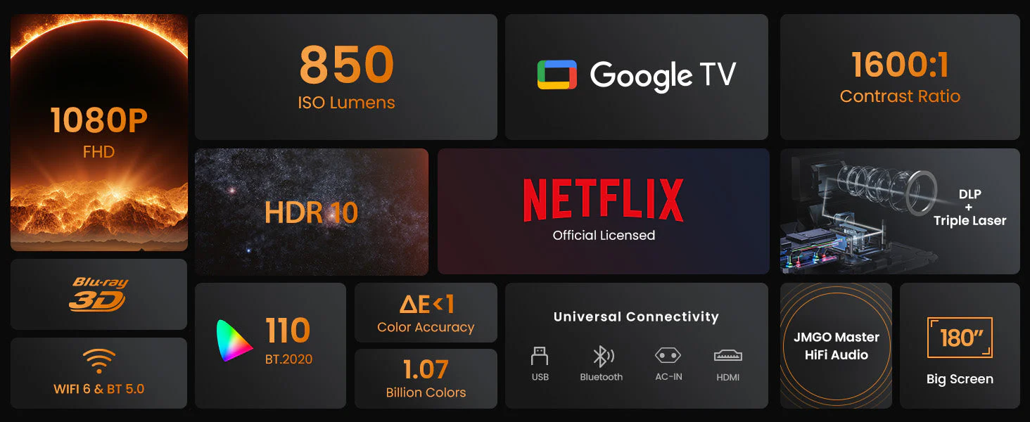 Der JMGO N1S ist ein kompakter Full-HD-Projektor mit moderner Triple-RGB-Laser-Technologie, der brillante Farben und starke Kontraste liefert. Dank integriertem Gimbal-Stativ lässt sich das Bild flexibel ausrichten, während Autofokus und automatische Trapezkorrektur für eine schnelle Einrichtung sorgen. Mit Google TV, Chromecast, Sprachsteuerung und nativer Netflix-Unterstützung ist der N1S bestens vernetzt. Zwei integrierte Lautsprecher sorgen für ordentlichen Klang, während HDMI eARC den Anschluss externer Audio-Lösungen erlaubt. Ideal für flexibles Heimkino – zuhause oder unterwegs.