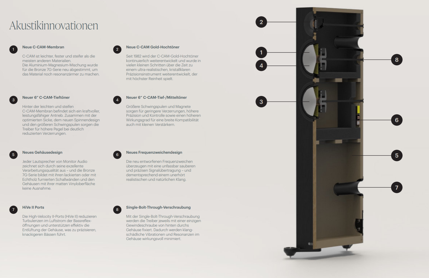 Der Monitor Audio Bronze 300 7G ist das Flaggschiff der neuen Bronze-Serie – ein eleganter 2,5-Wege-Standlautsprecher mit beeindruckender Klangqualität. Zwei 6″ C-CAM-Tieftöner und ein neu entwickelter Gold-Hochtöner mit UD Waveguide II sorgen für kraftvollen Bass, fein aufgelöste Höhen und ein ausgewogenes Klangbild. Die vergrößerten Schwingspulen garantieren hohe Pegelfestigkeit und Kontrolle, auch bei dynamischer Musik oder im Heimkino. Mit seinem wohnraumfreundlichen Design in Matt Schwarz, Weiß oder Walnuss fügt sich der Bronze 300 7G harmonisch in jedes Zuhause ein – für alle, die Wert auf starken Klang und stilvolle Optik legen.