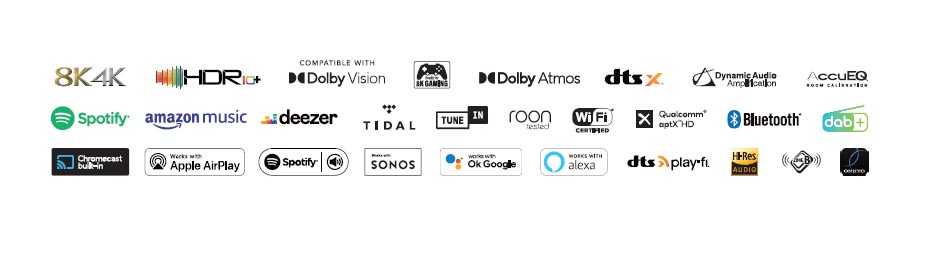 - SMART AV Receiver™ Arbeitet mit Sonos*1, Chromecast built-in™, AirPlay 2 und DTS Play-Fi®; umfasst Spotify®, Amazon Music HD*2, TIDAL, Deezer und TuneIn Streaming