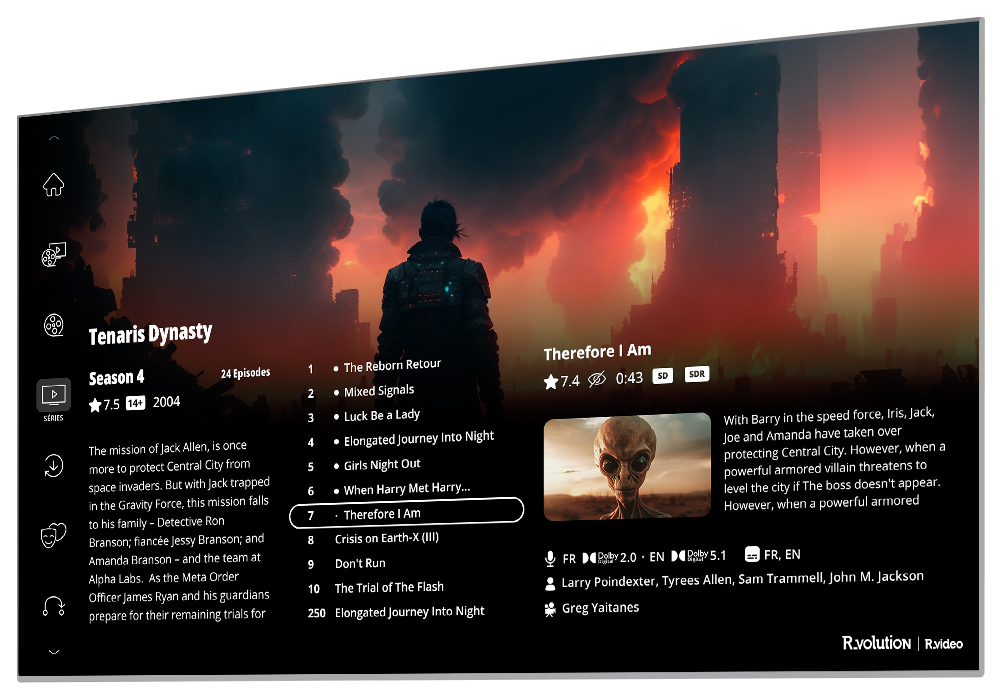 Der PlayerMini enthält R_video – die beste auf dem Markt erhältliche Unterhaltungszentrale mit einer beeindruckenden Benutzeroberfläche zur Erkundung Ihrer Filme und Fernsehsendungen. R_video scannt Ihre Videodateien, die sich auf einem lokalen Laufwerk befinden, das mit Ihrem PlayerOne verbunden ist, oder auf einem NAS über das lokale Netzwerk. Dann sammelt R_video das Coverbild, den Hintergrund und verschiedene Informationen wie Besetzung, Regisseur, Veröffentlichungsdatum, Bewertung usw. Dann müssen Sie sich nur noch in Ihrem Heimkino mit Ihren Freunden oder Ihrer Familie zurücklehnen und ganz einfach Ihren Film oder Ihre Fernsehsendung auswählen. Durchsuchen Sie ein Genre. Sortieren Sie Filme nach Bewertung, Dauer oder Erscheinungsdatum. Lesen Sie eine Synopsis. Spielen Sie den Trailer ab. Drücken Sie dann auf PLAY, um Ihren Film zu genießen. Warten Sie nach dem Abspann auf den automatischen Start der nächsten Folge Ihrer Fernsehsendung.