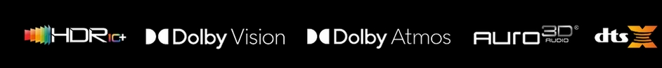 - Multichannel Heimkino Audio: Bitstream, downmix stereo (DTS, DTS-HD MA, DTS-HD HRA, DTS:X, DTS:X Pro, Dolby Digital, Dolby Digital EX, Dolby Digital Plus, Dolby TrueHD, Dolby Atmos, Auro 3D).