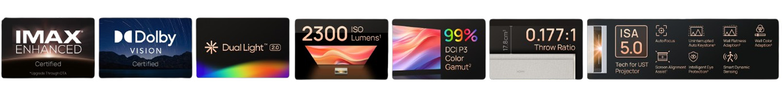 XGIMIs Dual Light 2.0-Technologie verwendet ein unglaubliches 0,177:1 Ultra-Kurzdistanzobjektiv. Platzieren Sie den AURA 2 einfach in der Nähe der Wand ohne komplizierte Installation, um eine eindrucksvolle Heimkino-Leinwand von bis zu 150 Zoll auf kurze Distanz zu erstellen