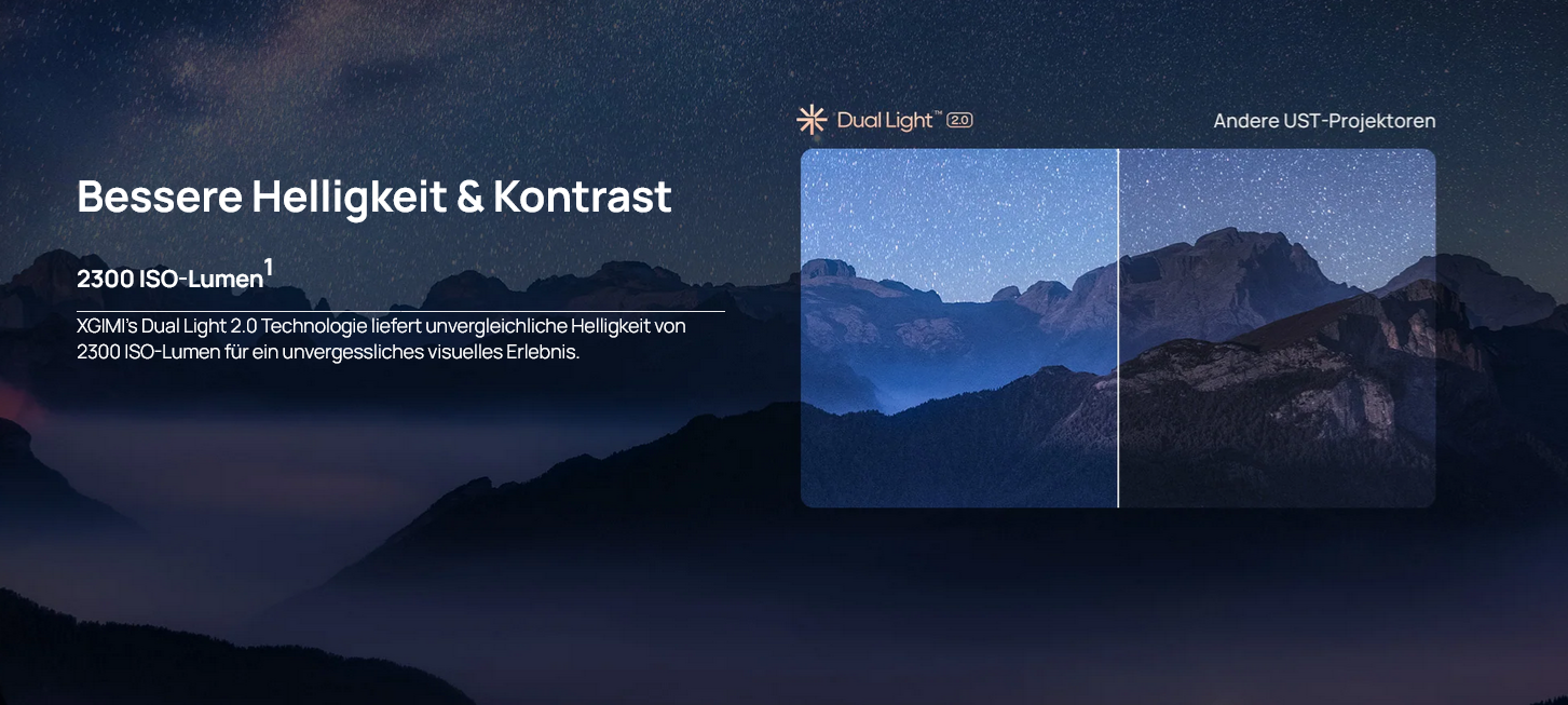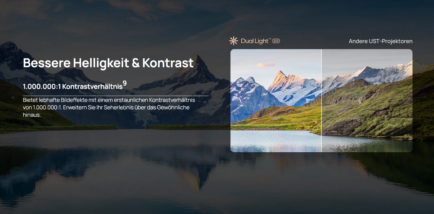 - 2300 ISO-Lumen Helligkeit: Der Projektor bietet eine beeindruckende Helligkeit von 2300 ISO-Lumen und damit eine klarere Darstellung in hellen Umgebungen. Dies wird durch die Dual Light 2.0 Technologie ermöglicht, die im Vergleich zu herkömmlichen Projektionstechniken eine verbesserte Helligkeit ohne Farbverlust liefert.