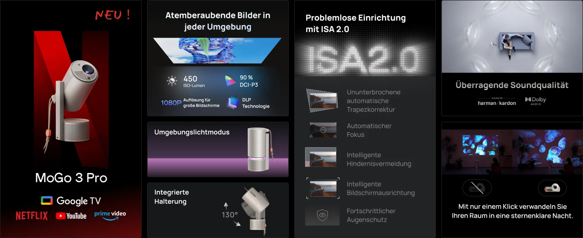 Der MoGo 3 Pro ist nicht nur kompakt, sondern auch leicht und mit einem integrierten Standfuß ausgestattet, der eine Drehung von bis zu 130° ermöglicht. Dies bietet Flexibilität bei der Projektion auf unterschiedlichste Oberflächen. Trotz seiner handlichen Größe bietet der Projektor mit seinem langlebigen LED-Licht eine Lebensdauer von bis zu 25.000 Stunden. Zudem können Sie den MoGo 3 Pro dank des Bluetooth-Lautsprechersystems von Harman/Kardon auch als Audiosystem nutzen. Mit der Unterstützung von Dolby Audio und verschiedenen DTS-Formaten liefert er klaren, satten Klang für Filme oder Musik. Ob für Präsentationen, Filmabende oder unterwegs – der MoGo 3 Pro bietet vielseitige Unterhaltungsmöglichkeiten in einem kompakten, leistungsstarken Gerät.