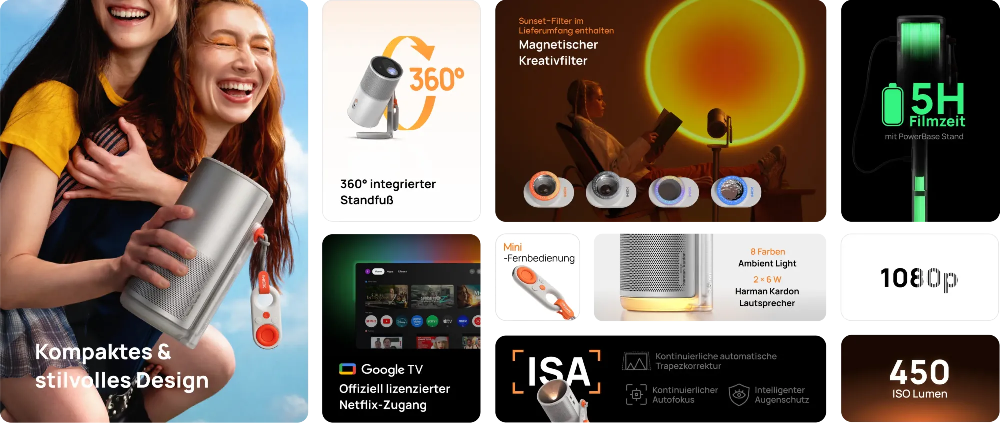 Der XGIMI MoGo 4 ist ein kompakter Full-HD-Projektor mit integriertem Akku, Google TV und zertifizierter Netflix-App – perfekt für spontanes Heimkino oder Outdoor-Abende. Mit 450 ISO-Lumen, bis zu 120 Zoll Bildgröße und zwei Harman Kardon Lautsprechern bietet er beeindruckendes Entertainment im Taschenformat. Der drehbare 360°-Standfuß, automatische Bildanpassung (ISA) und der magnetische Sunset-Filter sorgen für flexible Nutzung und stimmungsvolle Atmosphäre. Per Handgeste lassen sich die Effekte sogar ohne Fernbedienung steuern. Ideal für unterwegs, kompatibel mit Powerbank und PowerBase.