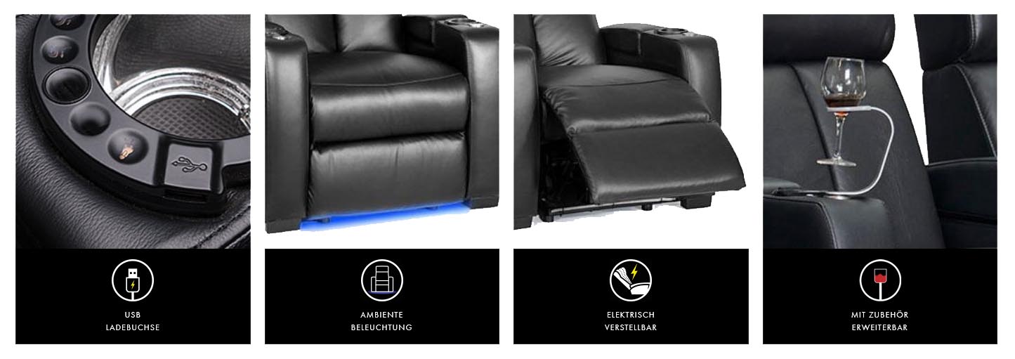 Darüber hinaus können die Sessel nachträglich mit Extras auf Ihre Bedürfnisse abgestimmt werden. Wenn es doch eher das Glas Wein zum Film sein darf, dann geben Sie sich mit einem Becherhalter nicht zufrieden und nehmen Sie zusätzlich den Weinglashalter. Er sorgt dafür, dass der Wein da bleibt wo er hingehört. Ins Glas!