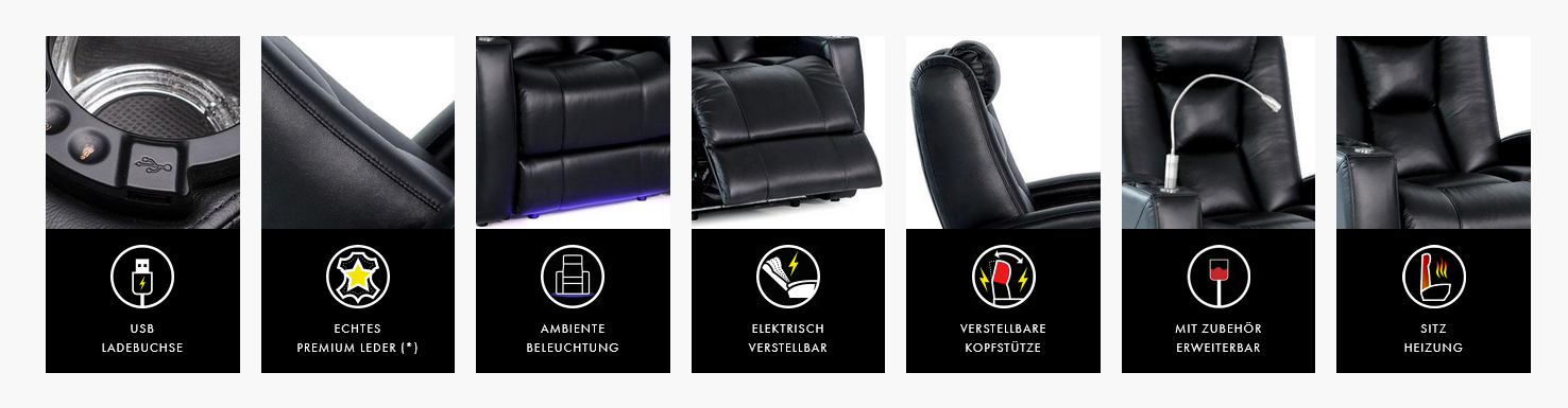 Individuell konfigurierbar: Passen Sie Ihren Kinosessel mit vielfältigen Optionen an Ihre Bedürfnisse an – von der Ambientebeleuchtung bis zum Weinglashalter.