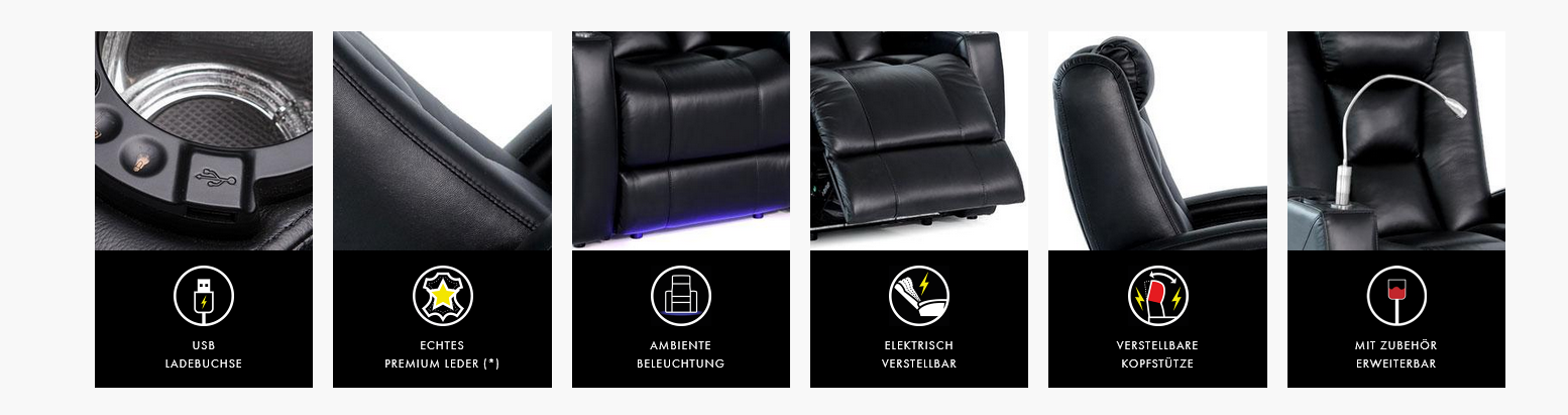Individuell konfigurierbar: Passen Sie Ihren Kinosessel mit vielfältigen Optionen an Ihre Bedürfnisse an – von der Ambientebeleuchtung bis zum Weinglashalter.